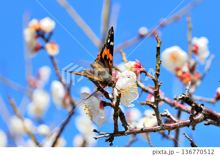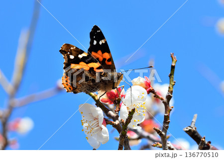 一隻紅蛺蝶正在吸食梅花的花蜜