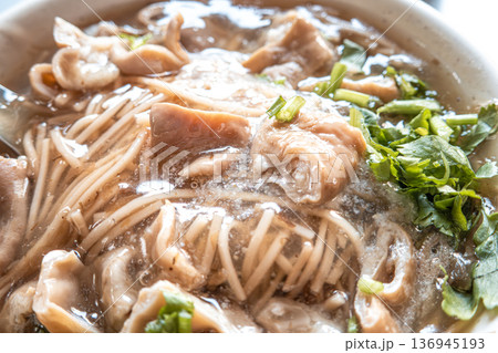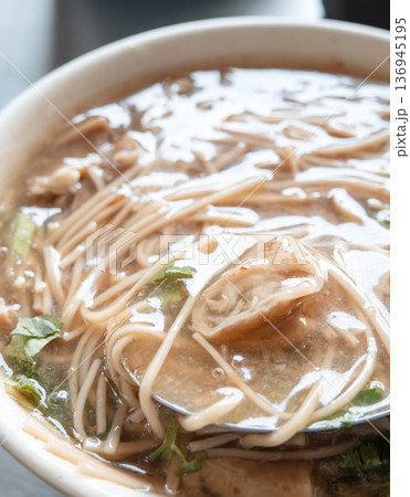 在餐廳拍攝一碗台灣美食大腸蚵仔麵線