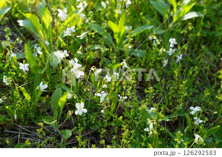 Blooming wild flowers under a tranquil golden sun light in the spring evening