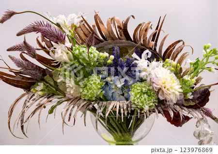 Beautiful flower composition with autumn green, blue and white flowers and herbs. Autumn bouquet in glass vase on white wall background.