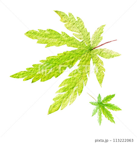 Set of green cannabis indica leaves painted in watercolor. Hand drawn marijuana illustration isolated on white