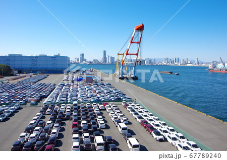日本橫濱市容 日本經濟的魔咒...大黑碼頭排隊的汽車...後面的汽車運輸船“ELEGANT ACE”