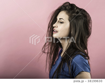 Young woman in a black bodysuit studio isolated on gray messing hair grimace