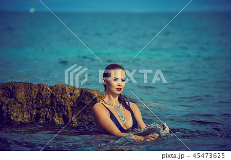 Monochrome photo of sexy lonely woman lying on rocky beach