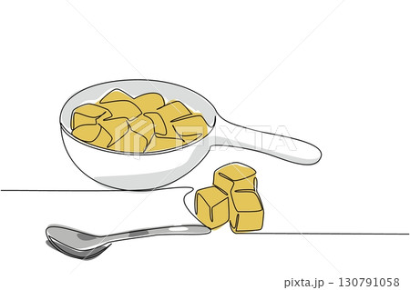 Single one line drawing croutons in bowl and some scattered on the side and add a stainless steel spoon. The food complement is ready. National Crouton Day. Continuous line design graphic illustration