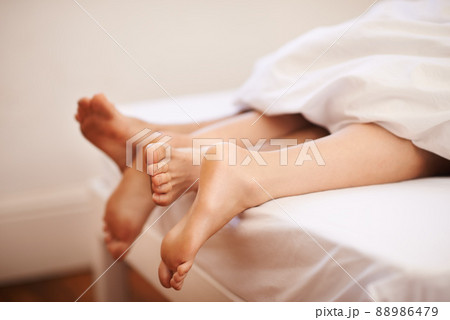 Cosy under the covers. Cropped view of a couples feet as they lie in bed together.