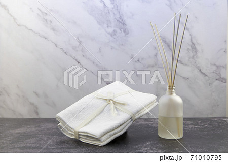 木桌上放置的白色毛巾