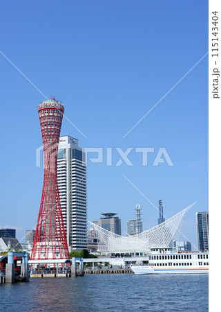 這是神戶臨海樂園的景觀,俯瞰美麗的鋼塔港口塔和外觀獨特的神戶海洋博物館。