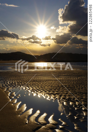 兵庫縣淡路島的田野濱海灘,夕陽映照下的海浪