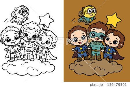 Group of three superhero kids with a flying superhero baby and a star on a cloud
