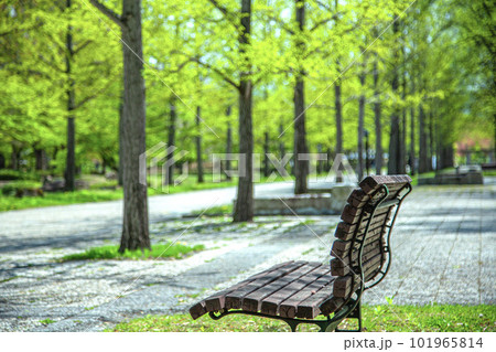 山形縣天童市秋季山形縣體育公園的銀杏樹、銀杏葉地毯和長凳