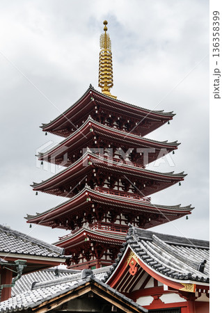 Building view of the Five-storied Pagoda of Kinryu-zan Senso-ji in Asakusa, Tokyo, Japan. The pagoda enshrines the relics of the Buddha, the founder of Buddhism.
