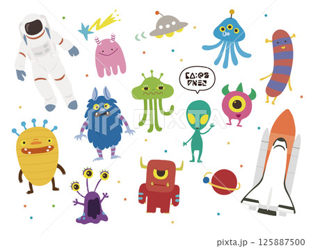 Funny cartoon alien. Space character in spaceship. Arcade game. Cute galactic UFO flying saucer. Universe shuttle. Extraterritorial astronauts invasion. Galaxy spacecraft. Vector cosmic garish set