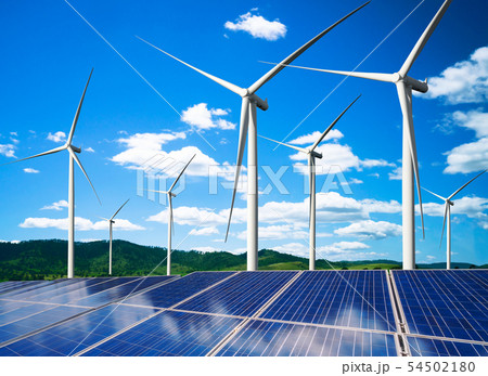 Solar energy panels photovoltaic cell and wind power plants on the seashore landscape for production of renewable green energy