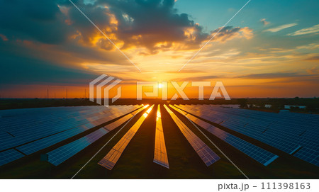 Industrial solar energy facility with uniform rows of panels converting sunlight into renewable electricity. Focus on sustainable development and emission-free energy generation