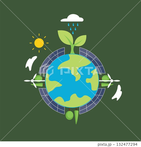 vector illustration of Earth Day, eco-friendly energy ideas, with solar panels and wind turbines