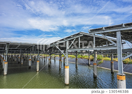 Floating solar photovoltaic panels at sustainable electrical power plant for generating clean electric energy. Concept of renewable electricity with zero emission on water surface