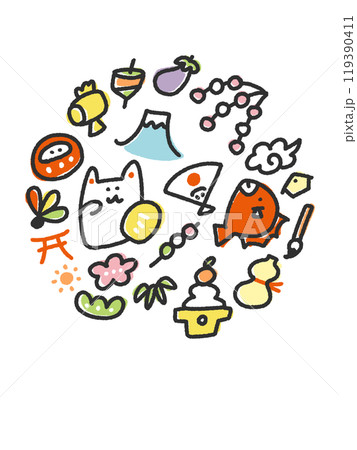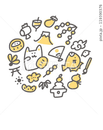 可愛的新年吉祥物插圖、新年卡片材料、手繪、線條畫