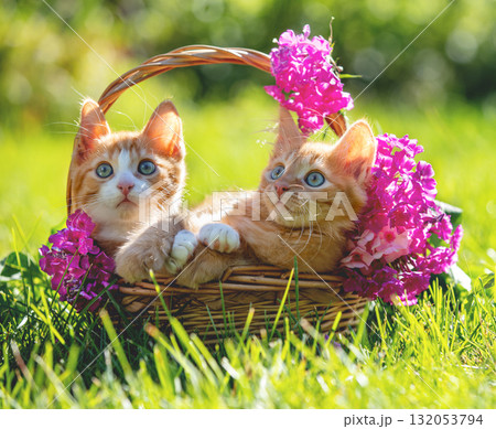Cats with flowers outside. Two adorable kittens sit in a basket on the grass among phloxes in a summer garden on a sunny day.