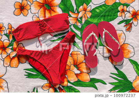 Red bikini polka dots print with matching flip flops sandals top view on beach towel ready for summer travel vacation holiday. Fashion swimwear womens clothing tropical getaway.