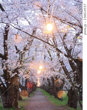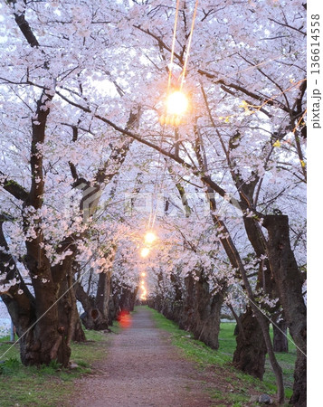秋田縣角館市檜木內河岸公園的夜景櫻花在燈光的襯托下,倒映在河面上。