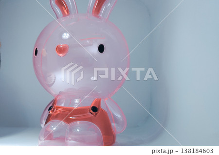 Transparent Pink Bunny Toy in Orange Overalls Isolated on Studio Background