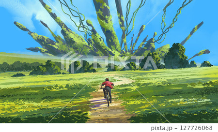 Cyclist Approaches Alien Growth in Open Field