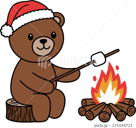 Santa Hat Bear Roasting Marshmallow Cartoon Illustration