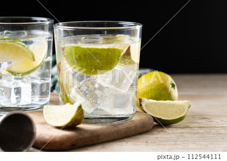 Glass of vodka tonic cocktail on wooden table