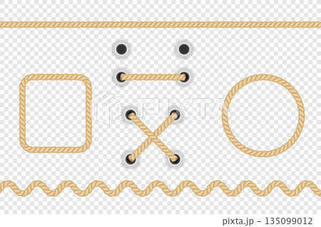 Rope border and frame collection. Twisted rope lines with decorative knots, heart shape and loops. Nautical vector elements.