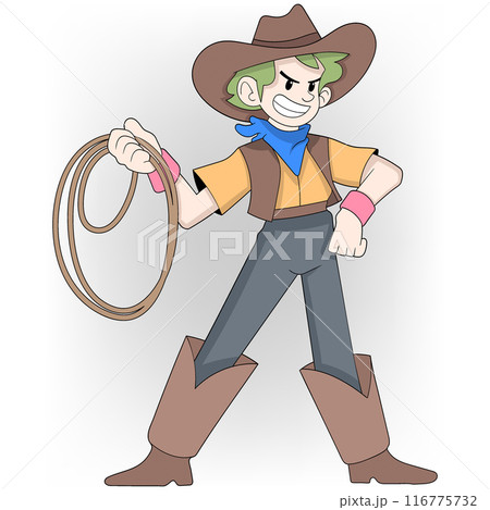 Cartoon flat style drawing brave cowboy with lasso on rearing horse. Stylized cowboy with rope lasso on horse. Happy American cowboy riding horse and throwing lasso. Graphic design vector illustration