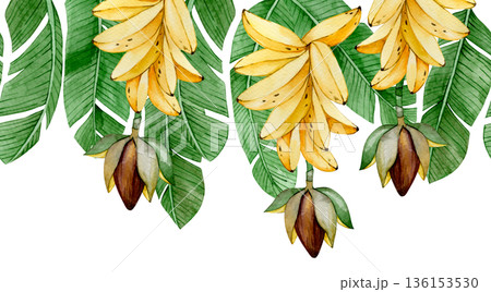 Watercolor seamless banana border with tropical leaves and banana palm fruits