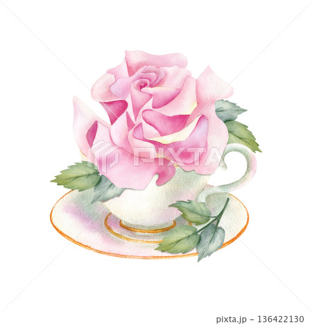 Delicate rose inside porcelain cup. Watercolor spring elegant floral illustration. Blooming flower with leaves. Hand painted botanical isolated composition. Vintage Lifestyle concept for your design