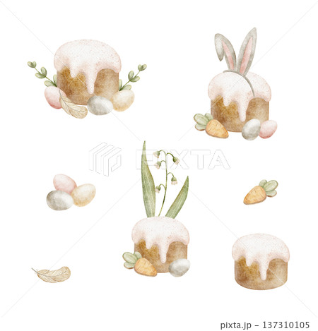 Set of Easter cakes, eggs, bunny ears, gingerbread, carrots, flowers, chicken feathers. Watercolor illustration food in children's style hand-drawn isolated from background for design of cards posters