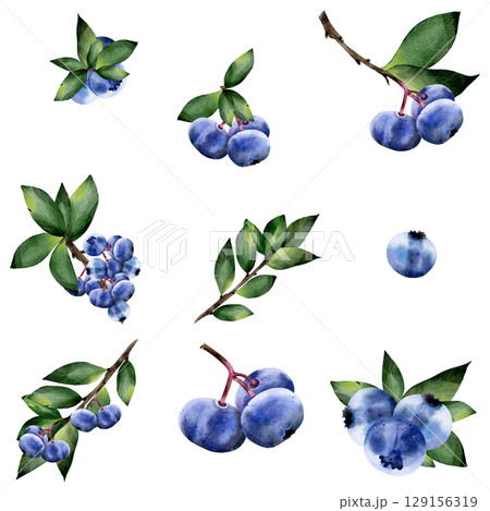 Seamless watercolor pattern in Blueberries with leaves, on a white background. Set. Isolated. Botanical illustration in realistic style. Hand drawn for design, fabric printing, scrapbooking, cards.