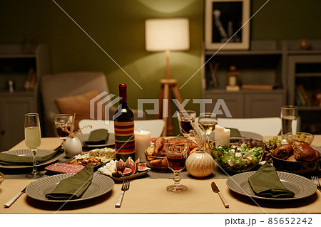 Image of dining table with food and appetizer preparing for dinner party in the living room