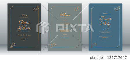 Luxury Wedding Invitation and Menu Set with Gold Vintage Frames on Black, Burgundy, and Navy Blue Backgrounds