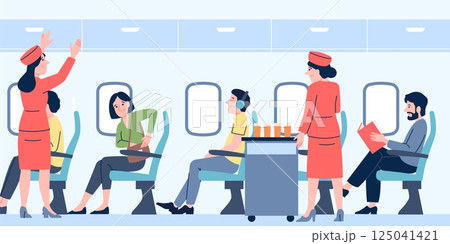 People in plane. Boarding complete, passengers sitting on board, stewardess with drinks in aisle. Travel by airplane, flight service recent vector scene