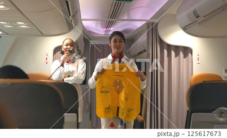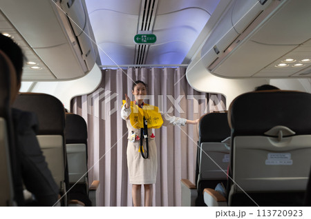 Asian stewardess safety explaining passengers prior to flight take off in airplane, air hostess uniform safety demonstration presenting pre-flight safety instructions life vest in emergency situation