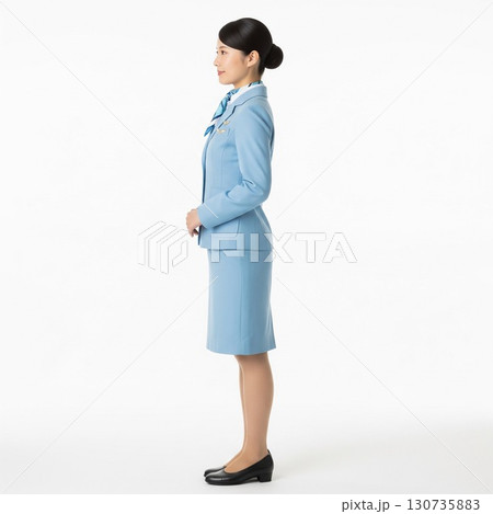 一位微笑著、背部挺直站立的空服員的全身側視圖(白色背景)