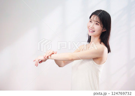 年輕女子在手臂上塗抹乳霜(簡單的背景)