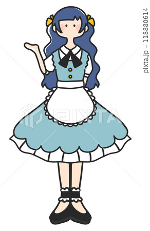 一個穿著女僕裝的可愛女孩正在擺出導遊的姿勢。