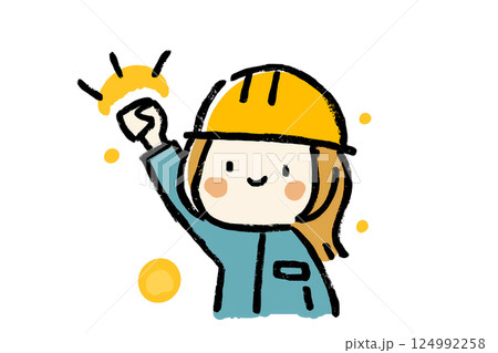 一名女工程師在建築工地穿著工作服,一邊微笑一邊握拳的插圖(安全帽、工作服、微笑)