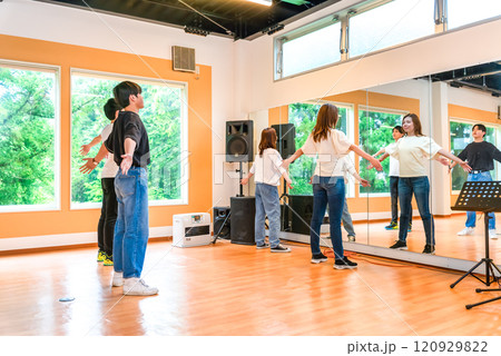 Group of teen children participating hip hop dance in class, following their teacher in dance school