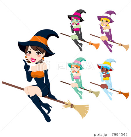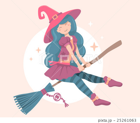 Cute Latina Girl Witch on the Broom. Happy