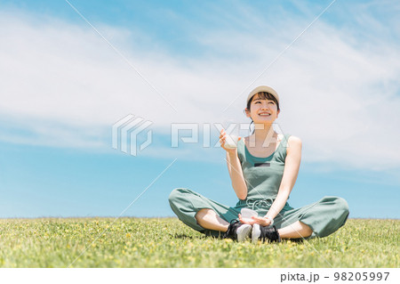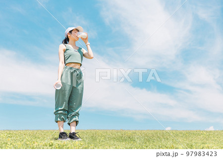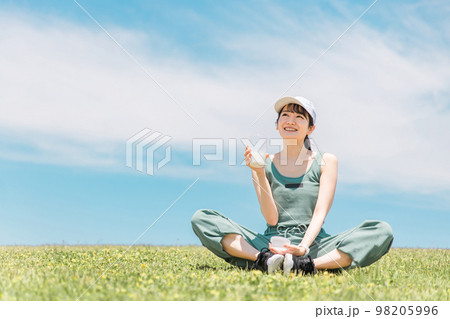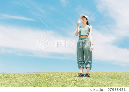 藍天下公園裡喝蛋白質、牛奶、豆漿的亞洲女性