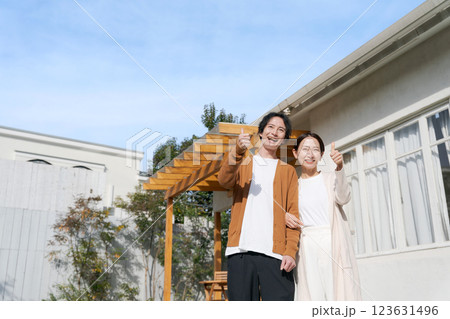 幸福的夫婦在花園裡微笑