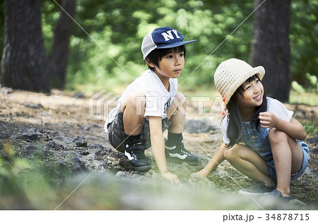 孩子們在陽光透過樹尋找昆蟲