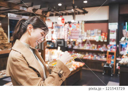 一位年輕女子懷舊地在老式糖果店購物[照片合作:大米/粗點心店加賀田Beikokuten]