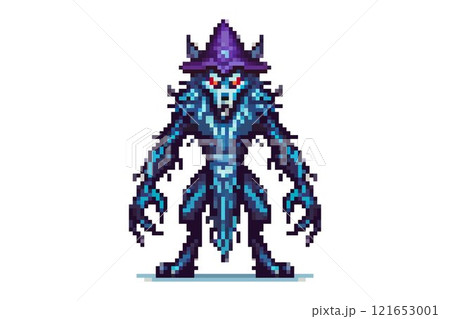 A pixel art creature with glowing red eyes horns and a robe evoking dark fantasy and mystery isolated on white background